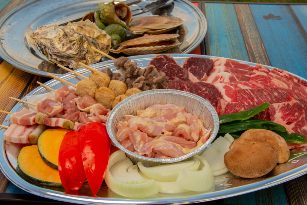 エア注入式テント(空気注入はスタッフが電動ポンプで行います)、テント用グランドシート、タープ、キャリーカート、寝袋(人数分)、寝袋マット(人数分)、テーブル、チェア(人数分)、ランタン、パーティーカウンターテーブル、BBQグリル、炭、火起し器、火消し壺、消火バケツ、消火器、BBQ用グッズバッグ(着火用ライター、金ブラシ、トング、火ばさみ)、ガスコンロ、ガスボンベ、クーラーボックス、保冷剤、ゴミ袋スタンド、調理鍋セット、紙皿、紙コップ、BBQ用アルミホイル、割り箸、洗剤、スポンジ、フキン