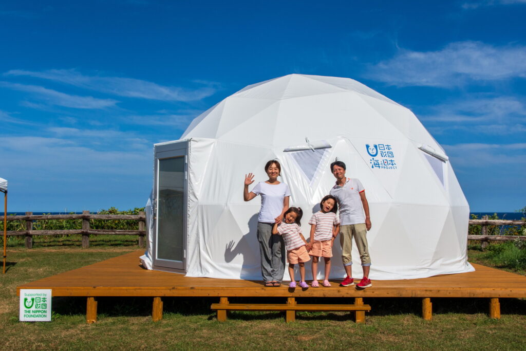 日本海を一望するドーム型テント「マリンピングテント」に泊まりながら、海洋体験や食事、たき火で優雅な休日を。要事前予約。